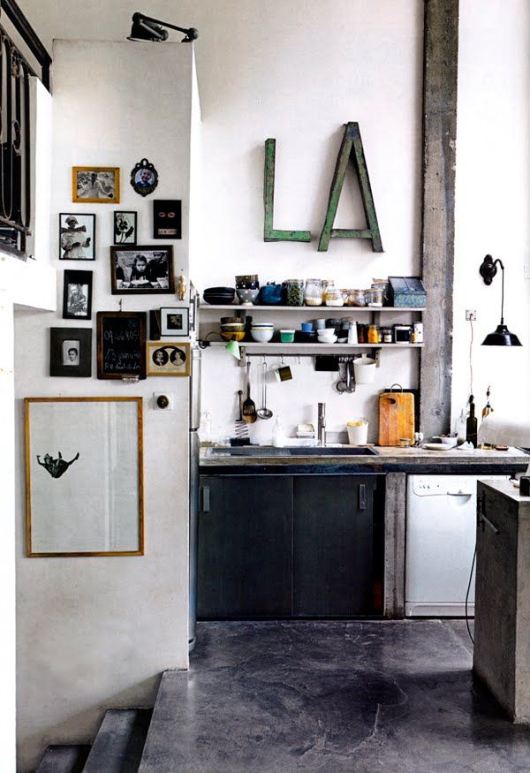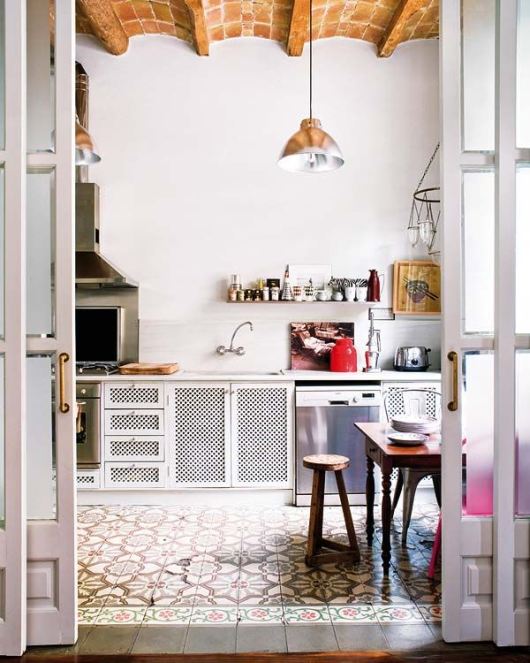 Suelos de madera rústicos con dibujo. Esta es una gran elección de pavimento para una cocina, a la que se quiera dotar de ese aire bohemio. Vía: www.from-london-with-love.com